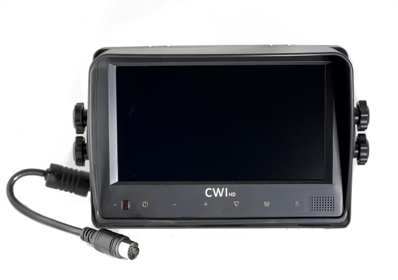 Screen is multi voltage input 10-32 volt with power to the cameras supplied through the leads from the screen. Screen has an improved clip on sun-visor to reduce glare and can support up to 4 Cameras.